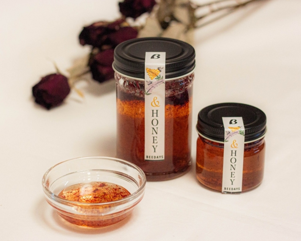 射水市で作られた食香バラの真空乾燥させたものを、蜂蜜と合わせました。真空乾燥はバラが高温にさらされないため香りが抜けず、本当にバラのいい香りが広がります!
