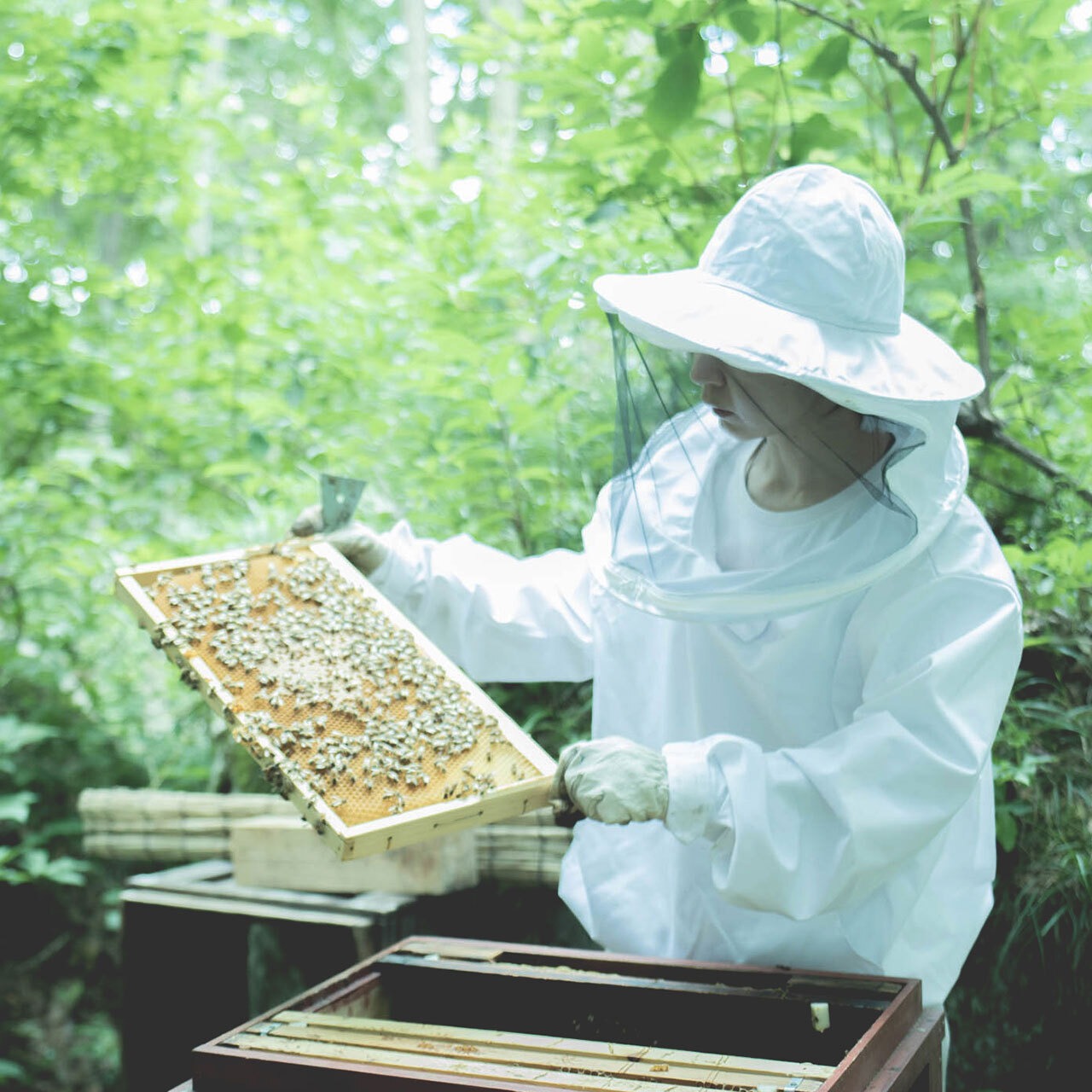 カラスザンショウ、クリ、ケンポナシなどの夏の花の百花蜜。春を経て一気に数が増えたみつばちがどんどん蜜を集める季節。フルーティで風味も春に比べて力強い感じ。質感はサラッとしています。